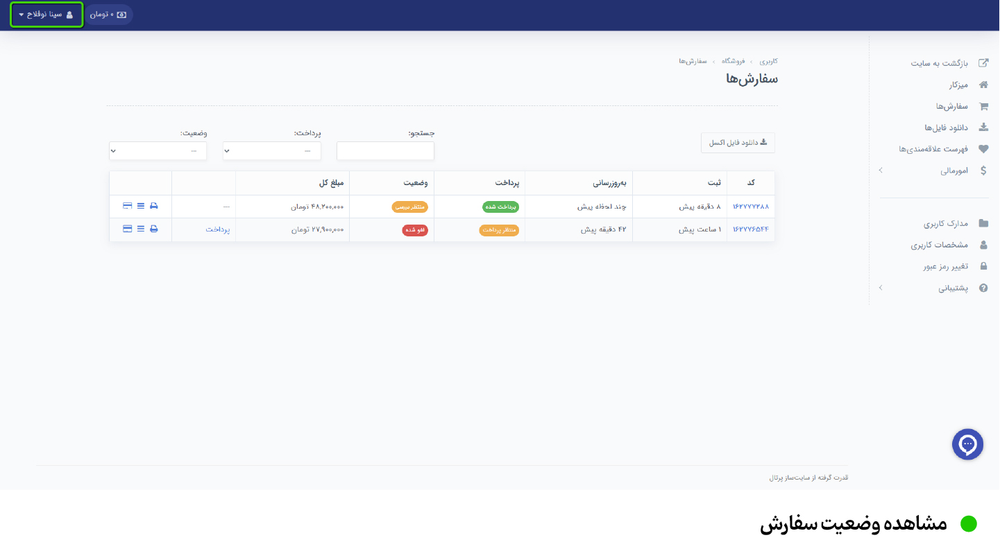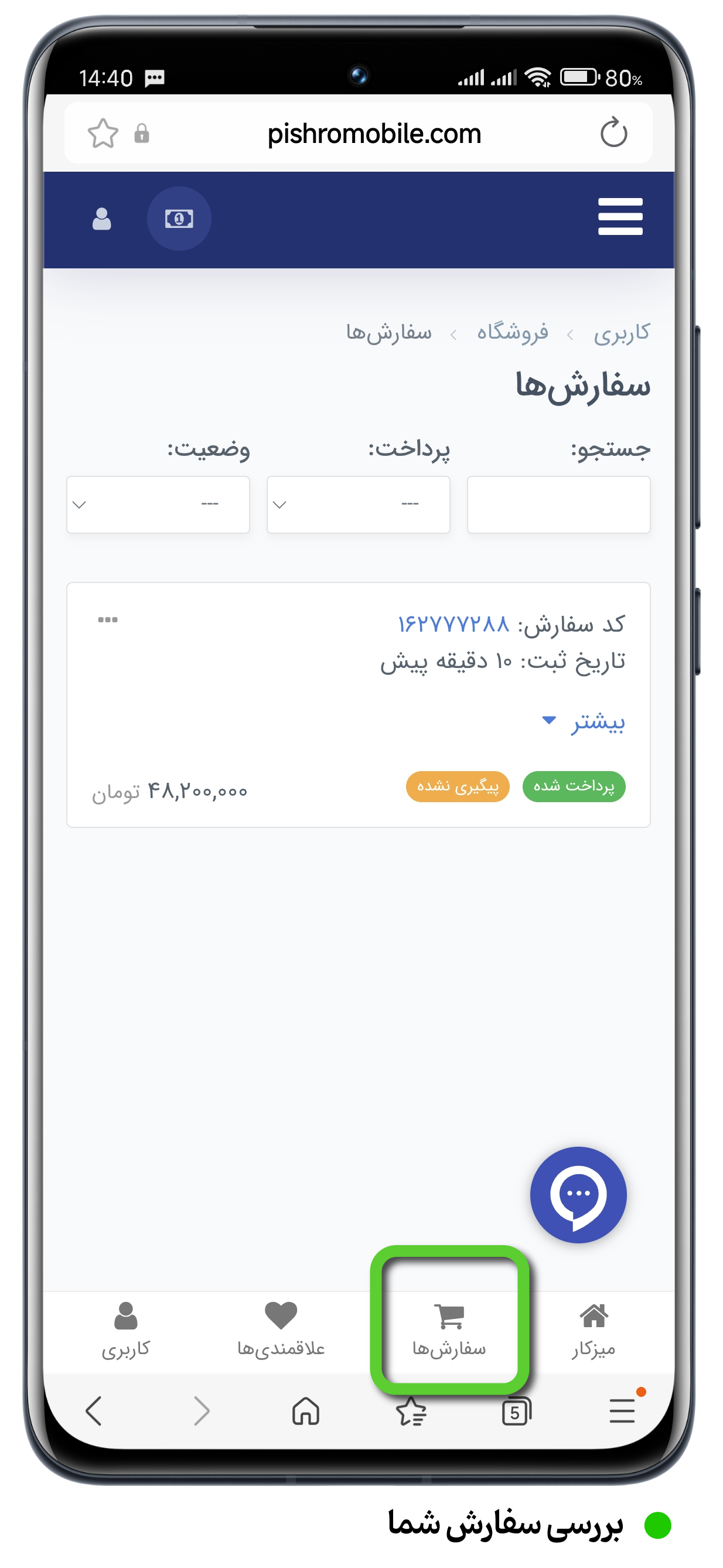 پس از ثبت سفارش، کاربران میتوانند از طریق بخش (سفارش ها) ، وضعیت پردازش و ارسال سفارش خود را مشاهده و دنبال نمایند. چنانچه خرید خود را تکمیل نکرده اید تا یک ساعت قادر به تکمیل فرایند خرید از همین بخش هستید در غیر این صورت رزرو شما لغو میشود