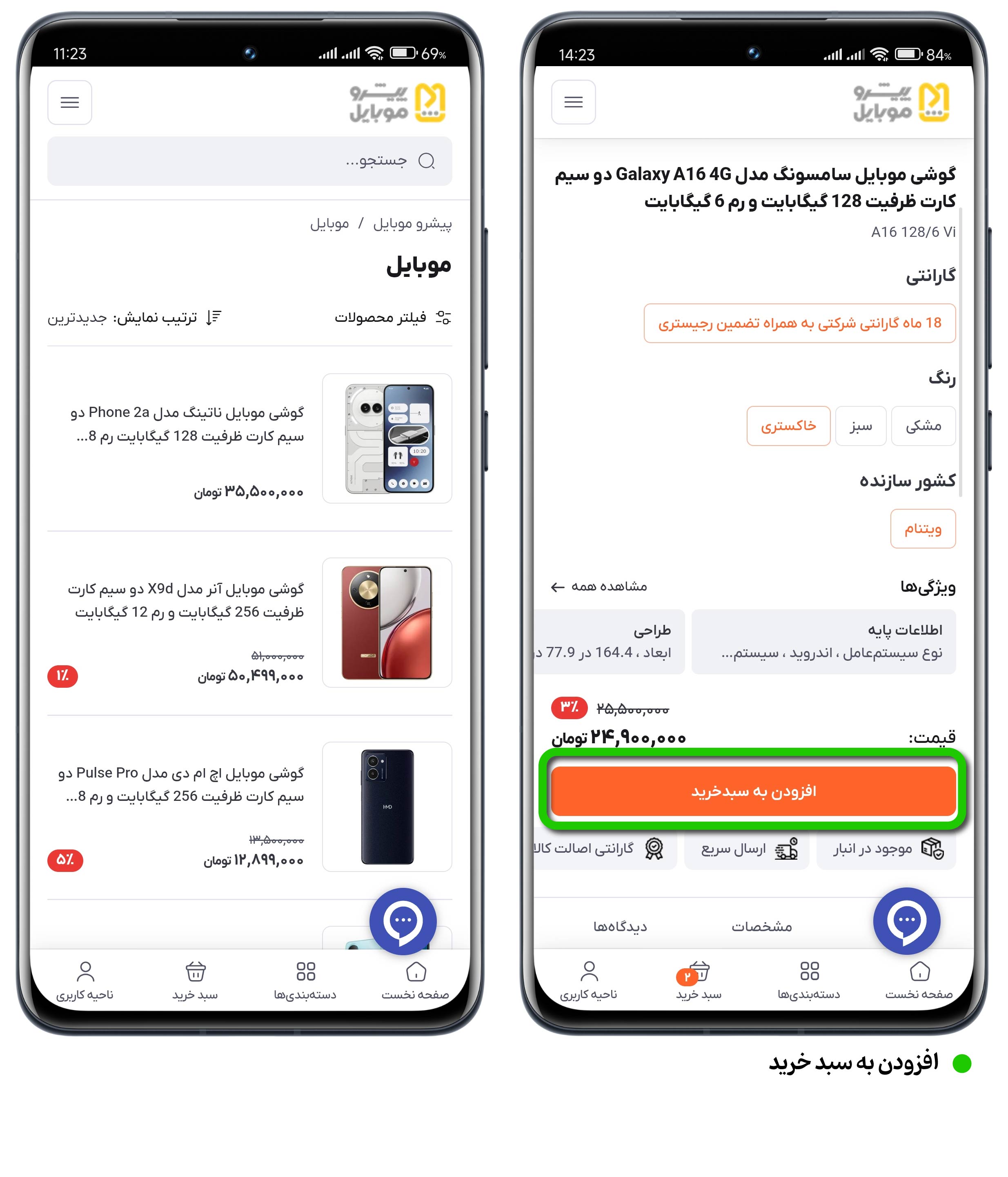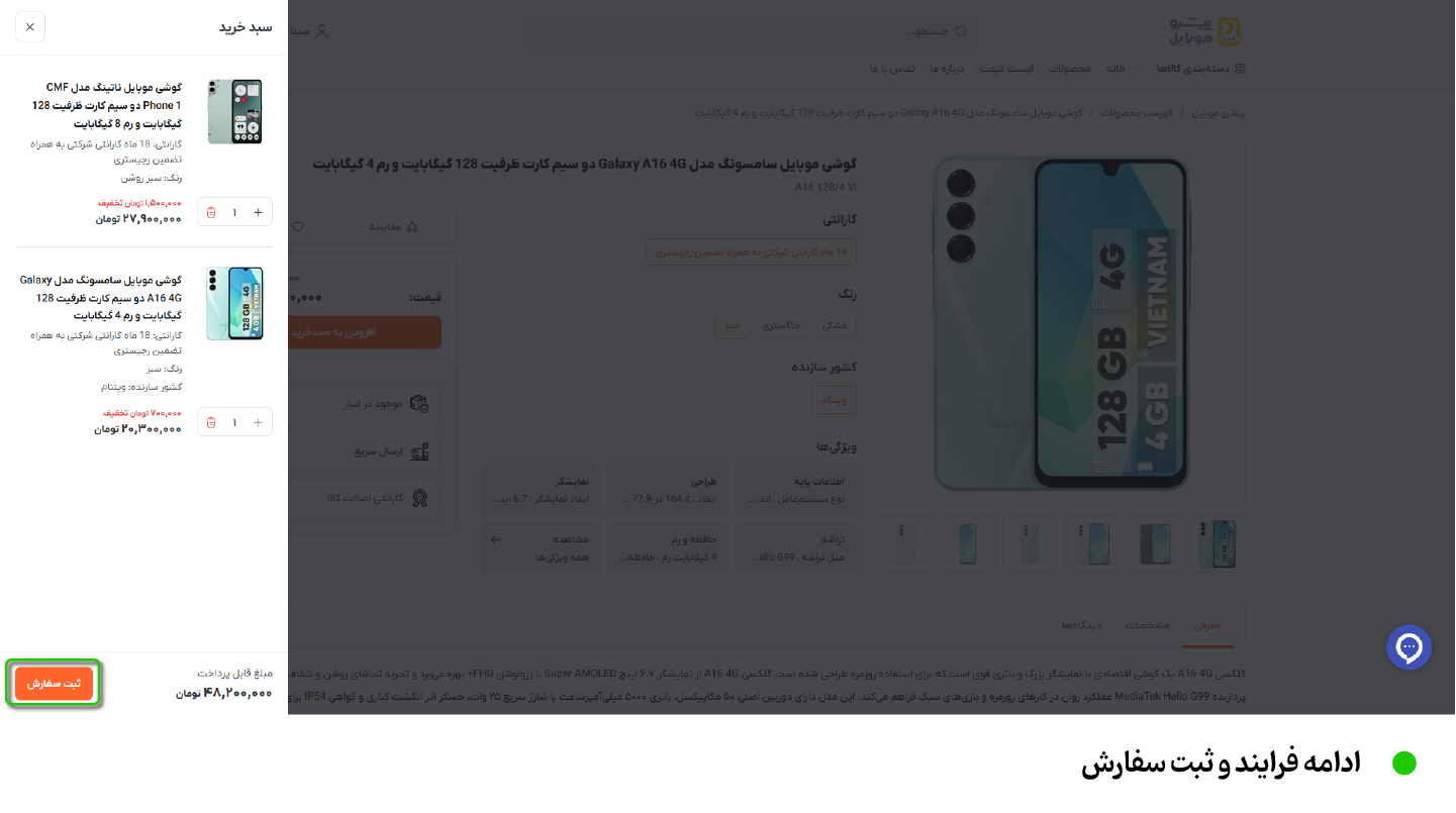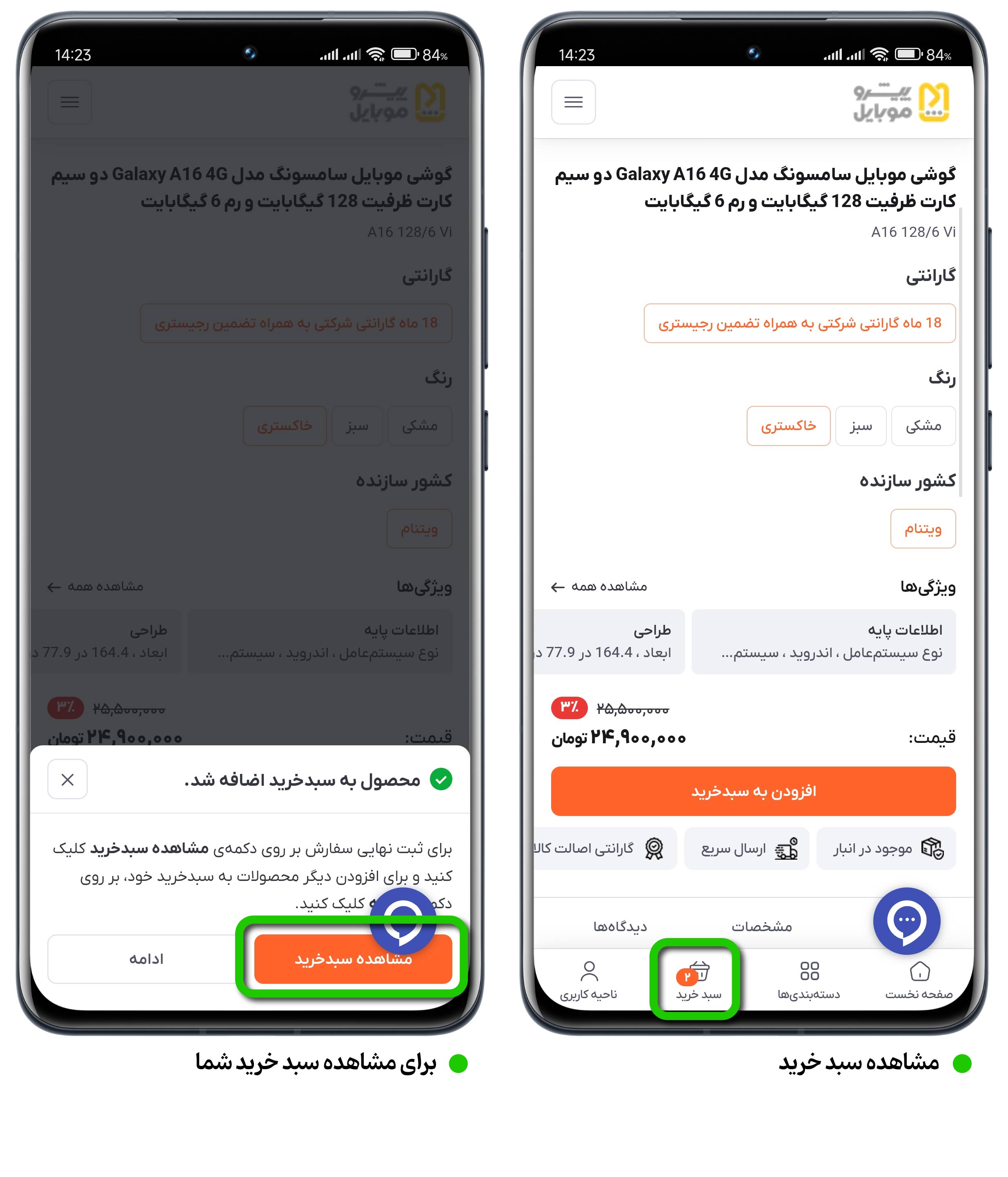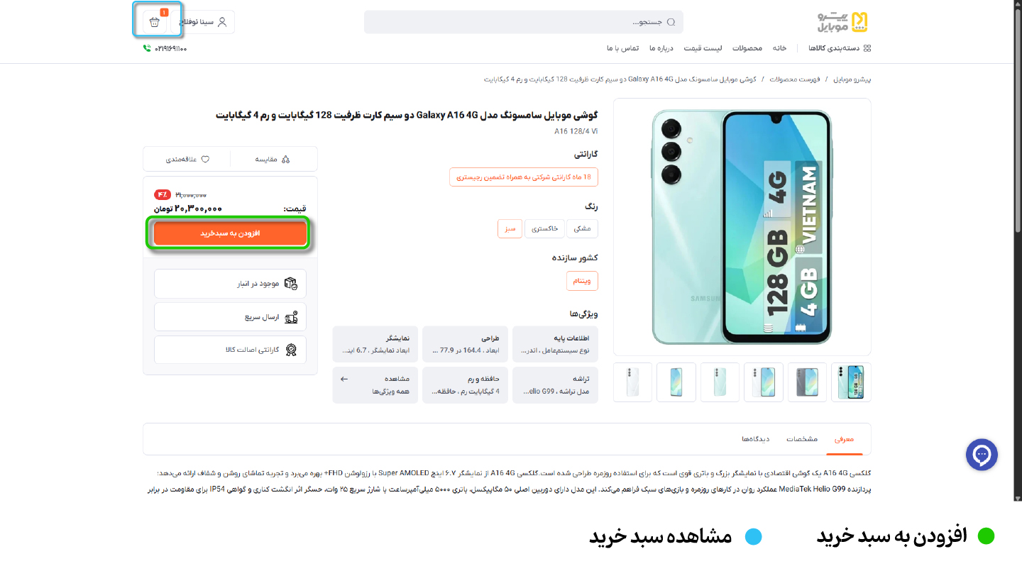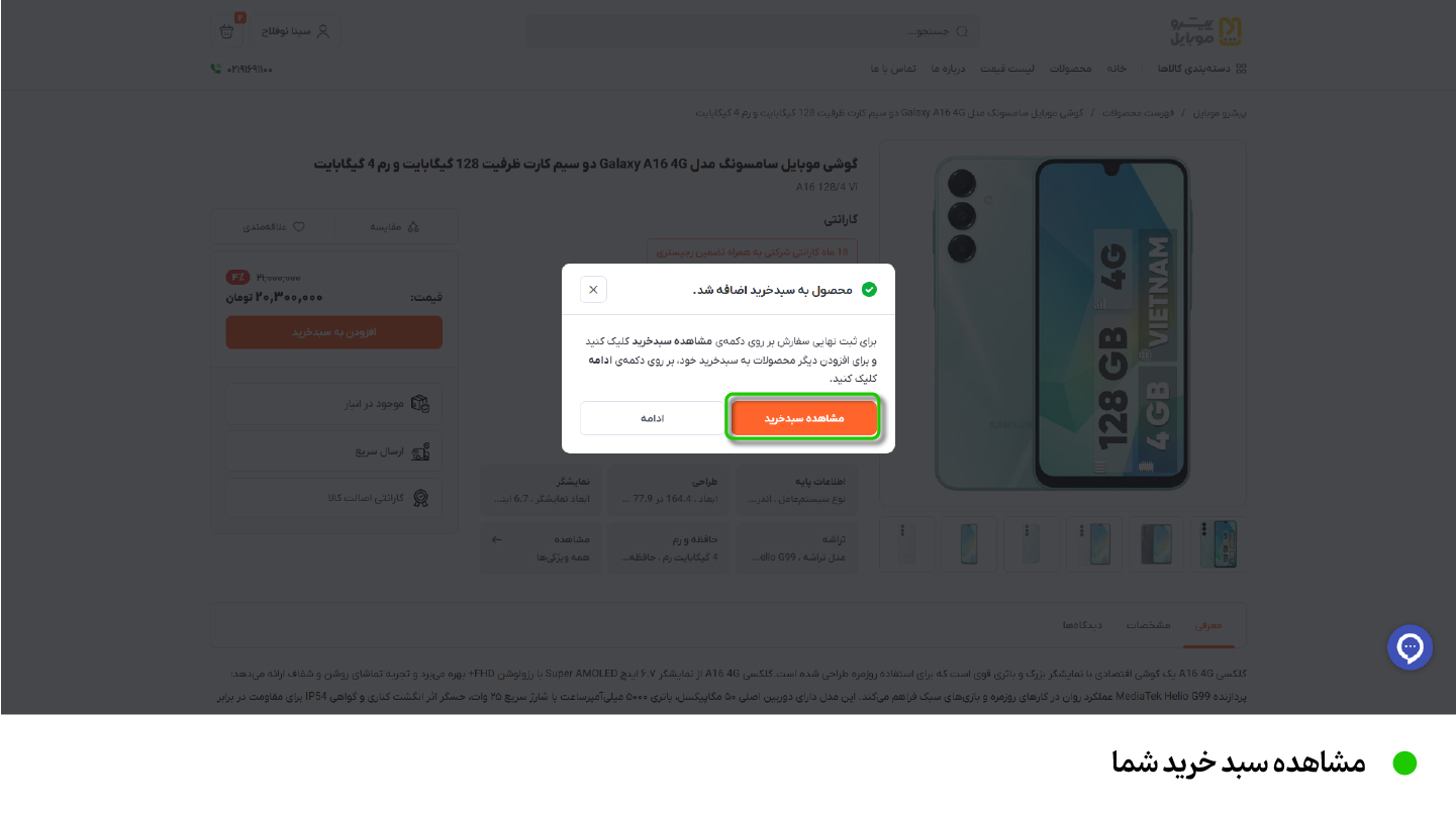 پس از انتخاب کالا، با کلیک بر روی گزینه (افزودن به سبد خرید)، محصول به سبد خرید شما اضافه خواهد شد. در صورت تمایل، امکان افزودن چندین کالا به سبد خرید وجود دارد.