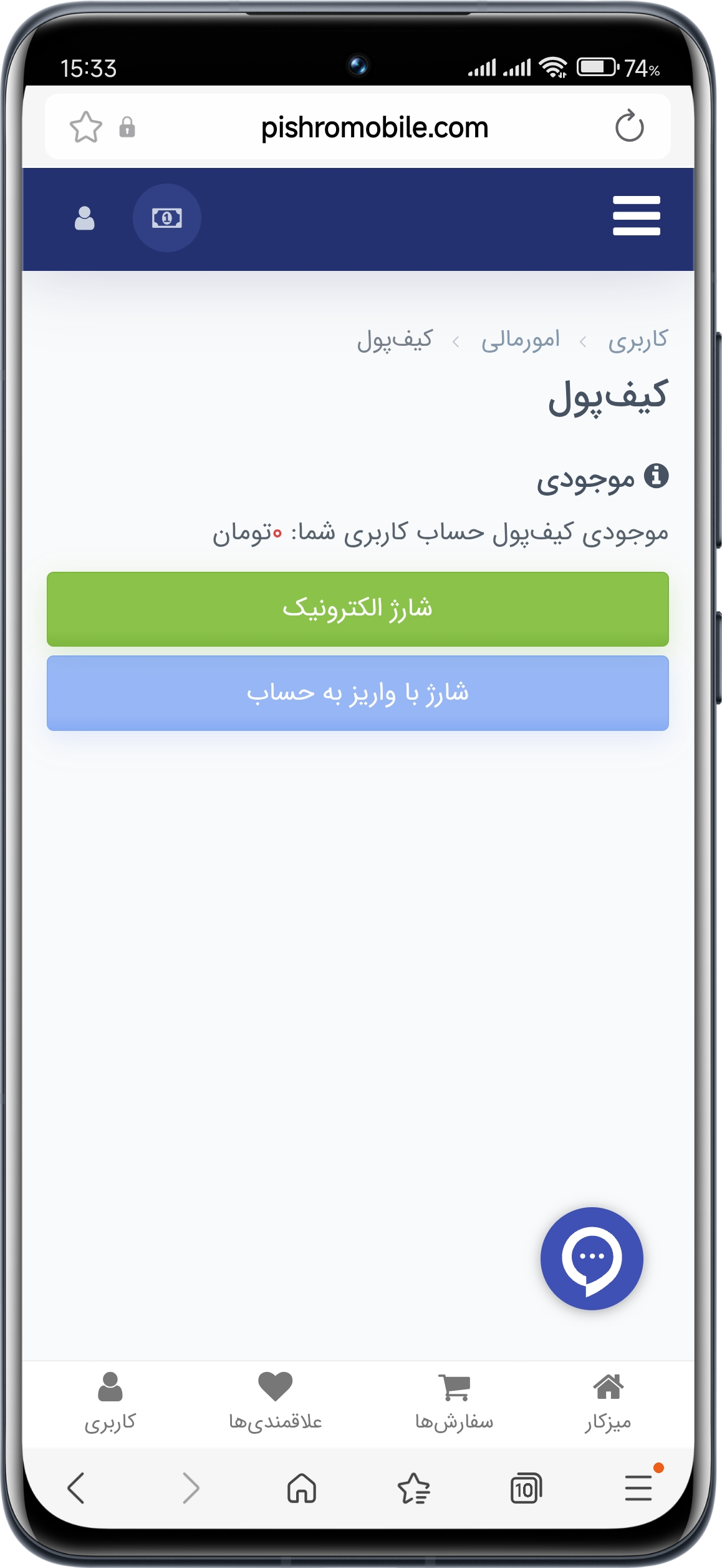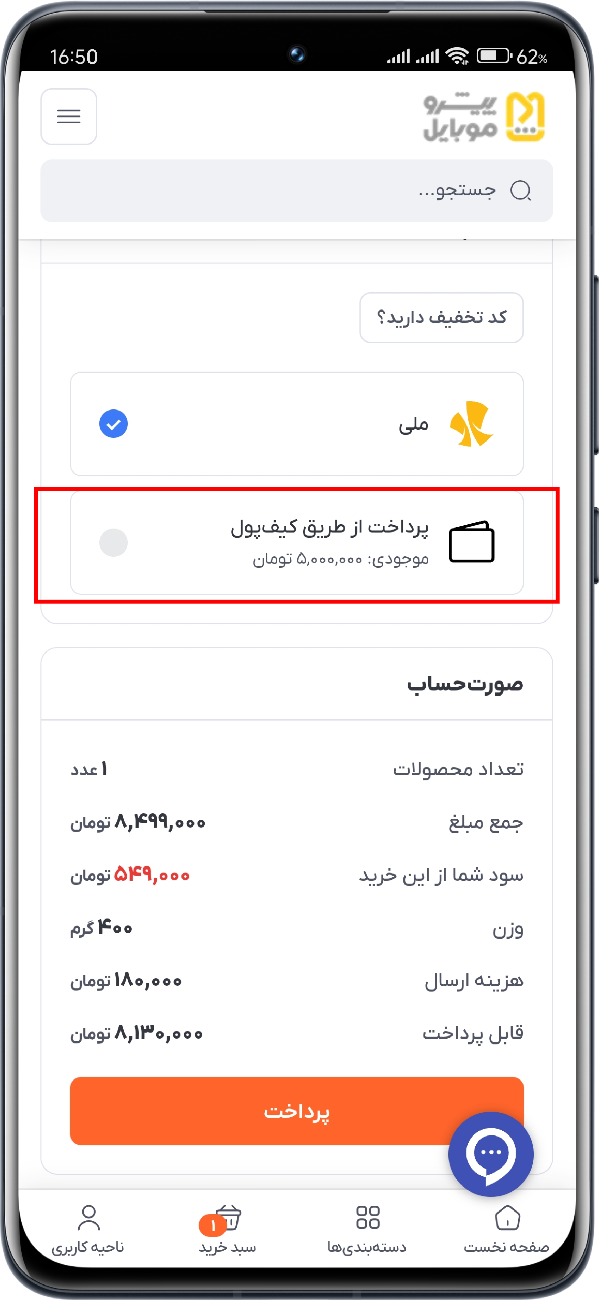 بعد از پرداخت و شارژ کیف پول خود، مبلغ واریز شده در قسمت حساب کاربری و هنگام خرید قابل مشاهده است.