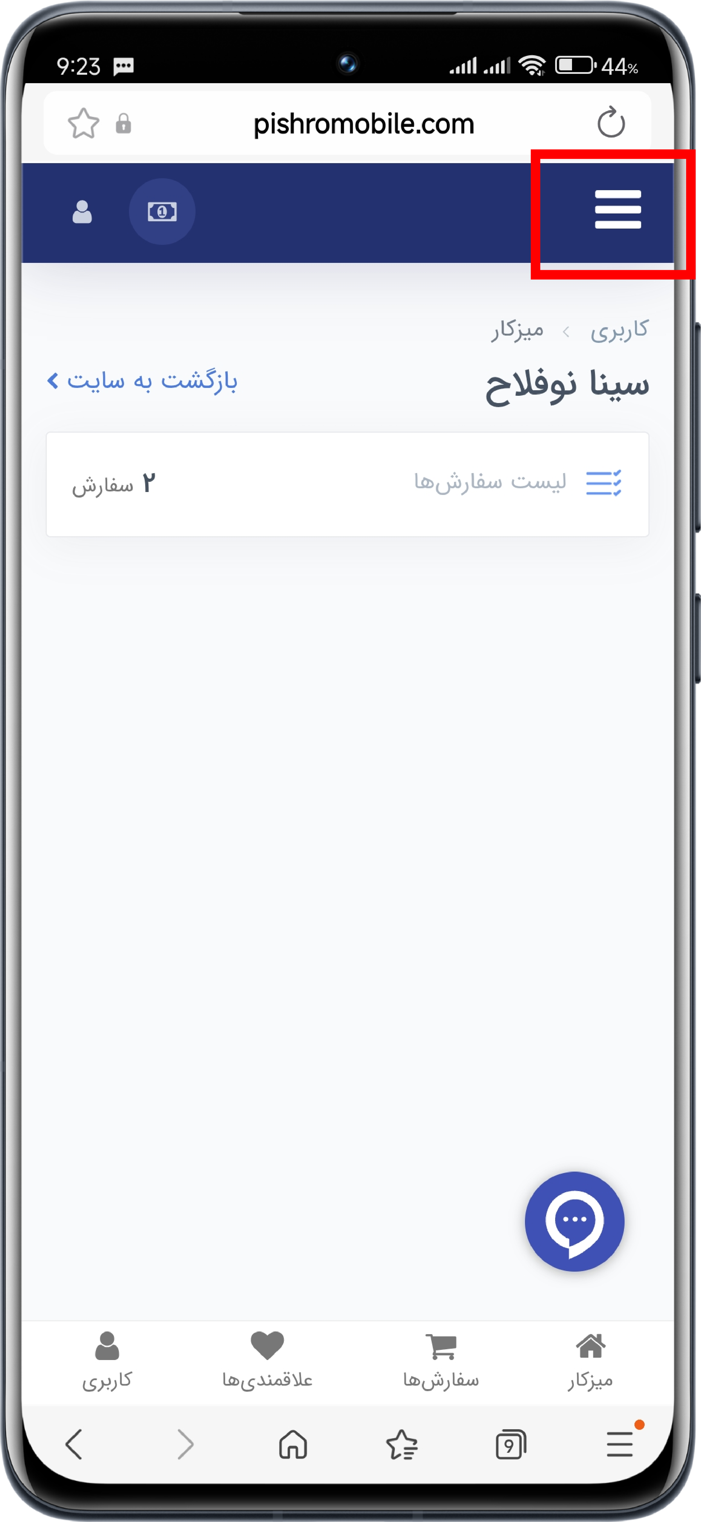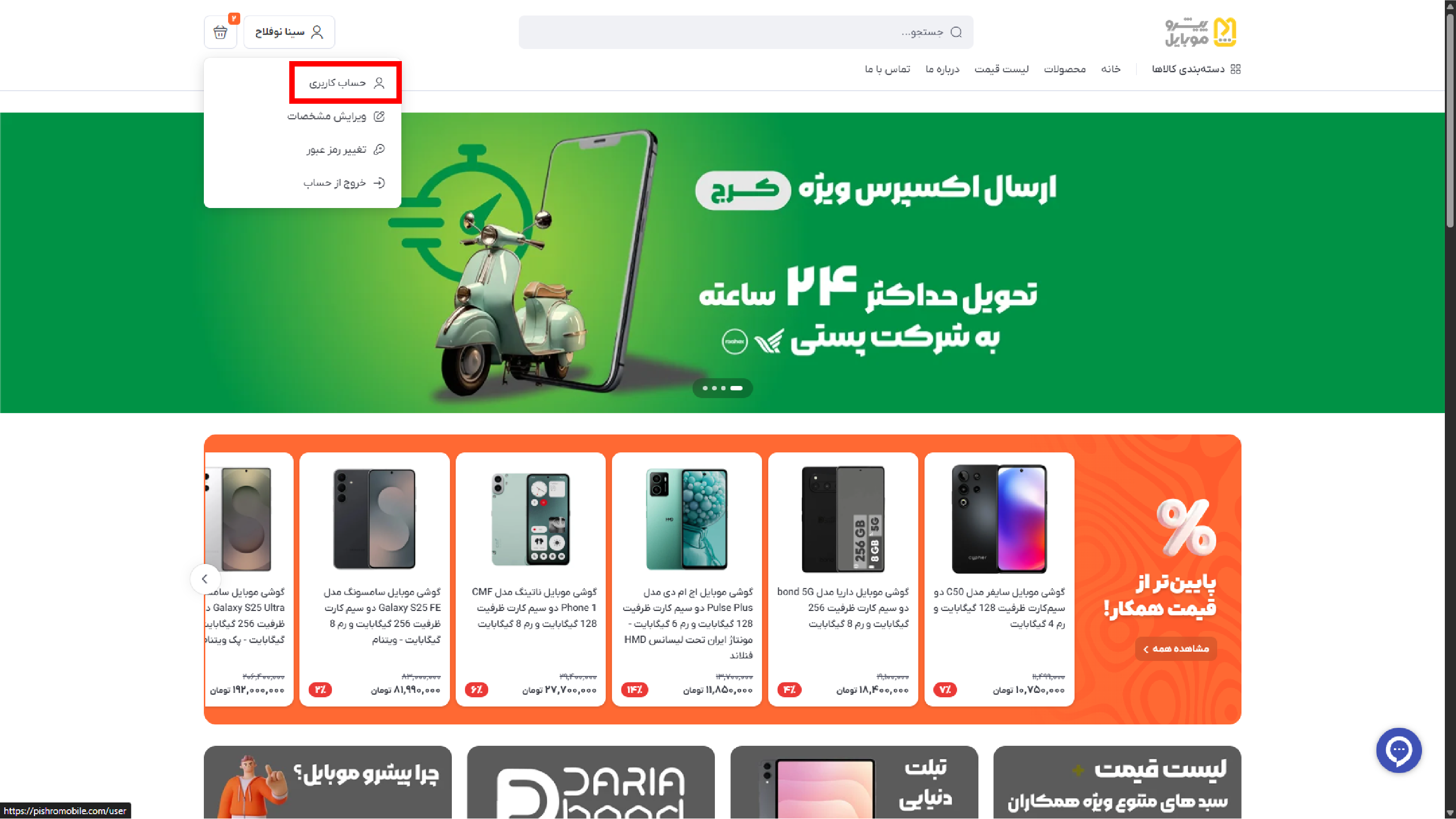 پس از ثبت نام در سایت، در صفحه اصلی سایت روی گزینه نامتان در بالای کادر صفحه بزنید.