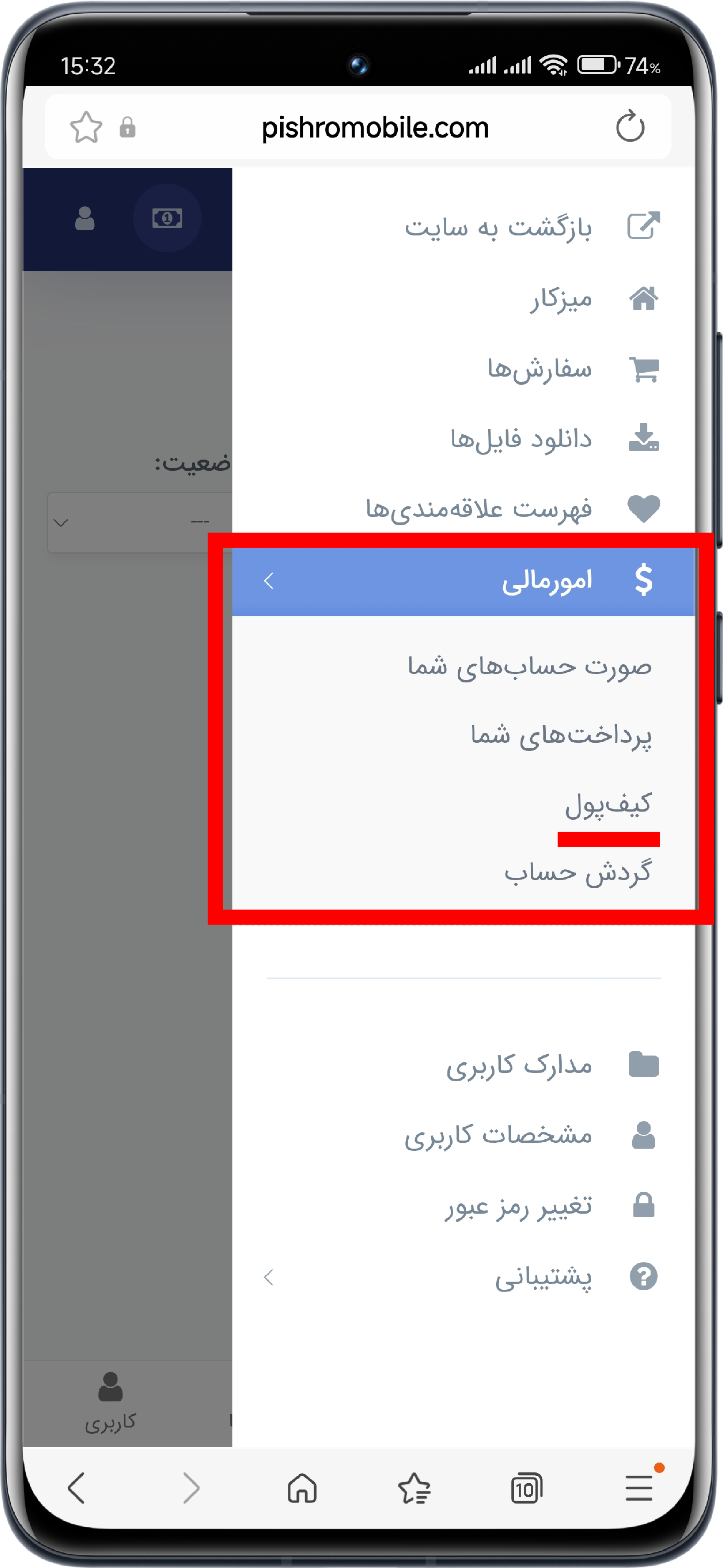 شاخه امور مالی، زیر شاخه کیف پول را انتخاب کنید.