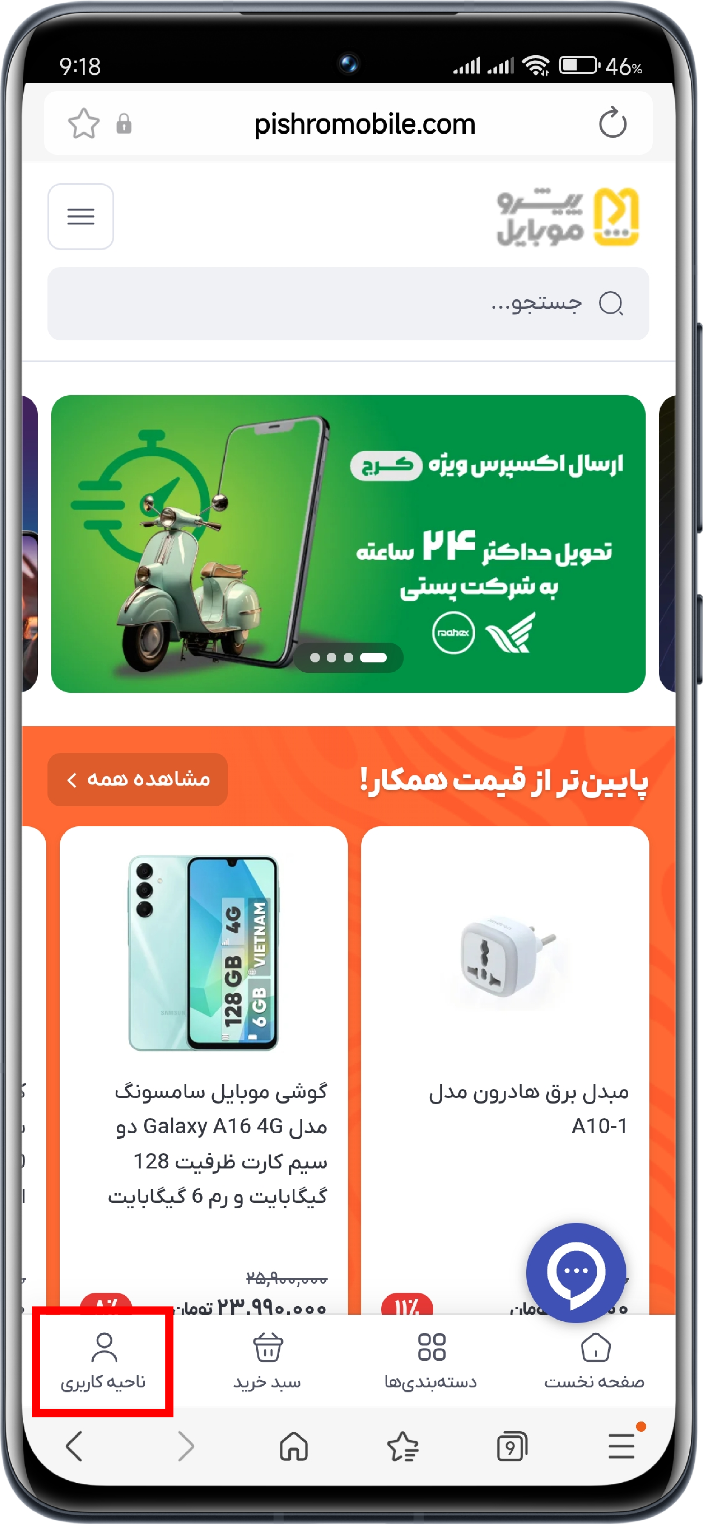 پس از ثبت نام در سایت، در صفحه اصلی سایت روی گزینه (ناحیه کاربری) در پایین صفحه بزنید.