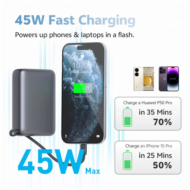 پورت USB-C با توان خروجی ۴۵ وات با ولتاژهای ۵V/۳A | ۹V/۳A | ۱۲V/۳A | ۱۵V\۳A و ۲۰V/۳A /- پورت USB-A با توان خروجی ۲۲.۵ وات با ولتاژهای ۵V/۳A | ۹V/۲A | ۱۰V/۱.۵A | ۱۲V\۱.۵A